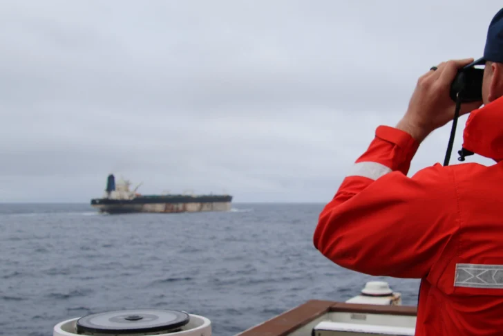 BBC Verify analizó imágenes publicadas por Russia Today, supuestamente tomadas a bordo de un petrolero, que mostraban un barco a lo lejos que coincide con el perfil de un guardacostas clase Legend de la Guardia Costera estadounidense.