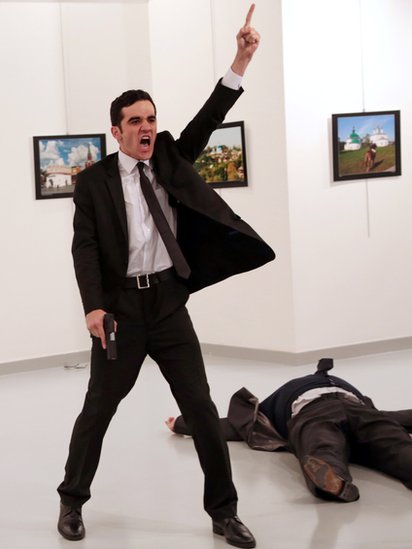 El atacante era un policía vestido de civil, que, segundos después de abrir fuego, gritó: "No olviden a Alepo, no se olviden de Siria", dijo hablando en turco y en árabe. "Allahu Akbar" (Dios es grande), añadió.