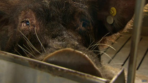 A mitad de camino por el largo cobertizo blanco, está el cerdo 29 -un macho grande, peludo con colmillos sobresaliendo. El 29 es un cerdo blanco, aunque está cubierto de pelo grueso y negro. Más importante aún, en el interior, tiene el páncreas de un cerdo negro.