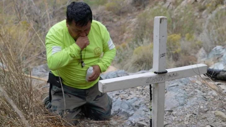 Octavio Soria, conocido entre los voluntarios como Chaparrito, carga en su mochila una cruz que sembrará en la tierra si encuentra los restos de Raúl en el desierto.