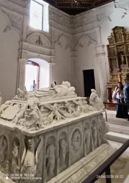 Su fachada es una espectacular muestra de arquitectura renacentista realizada en piedra con estatuas de alto relieve, escudos, figuras de cisnes, todo enmarcado por un cordón franciscano. Tiene mil detalles artísticos y arquitectónicos que transforman su contemplación en una experiencia.