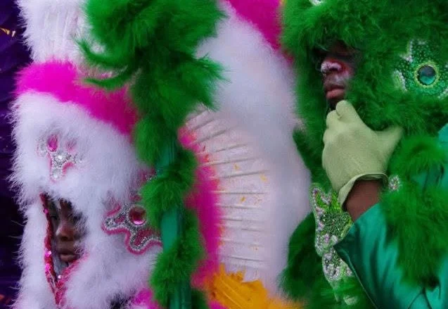 Mientras estas transformaciones ocurrían en distintos puntos del Caribe, al norte del Golfo de México otra historia seguía un curso paralelo. Nueva Orleans había sido, desde el período colonial, uno de los grandes puertos del Caribe ampliado, una ciudad donde circulaban comerciantes, marineros, migrantes y músicos procedentes de Cuba, Haití y las Antillas. Ese flujo constante de personas y tradiciones contribuyó a la formación de una de las prácticas culturales más singulares y significativas para las comunidades afrodescendientes de la ciudad: las tribus de Mardi Gras Indians, comunidades afroamericanas que comenzaron a desfilar durante el carnaval con trajes inspirados en imaginarios indígenas, plumas monumentales, bordados minuciosos y cantos rituales transmitidos de generación en generación.