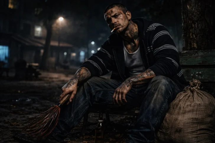 El escenario está oscuro. En el centro, se ve un parque. Bancas viejas, un árbol grande y un ambiente que parece familiar, pero algo sombrío. Entra un hombre de aspecto rudo, con ropa a rayas, un antifaz y un costal en la mano. Saluda a lo lejos, como si estuviera reconociendo a conocidos en su vecindario. Lleva una actitud desafiante pero tranquila, como si estuviera en su propio territorio. Llega a una banca y se sienta. El costal lo coloca a su lado mientras observa el entorno.