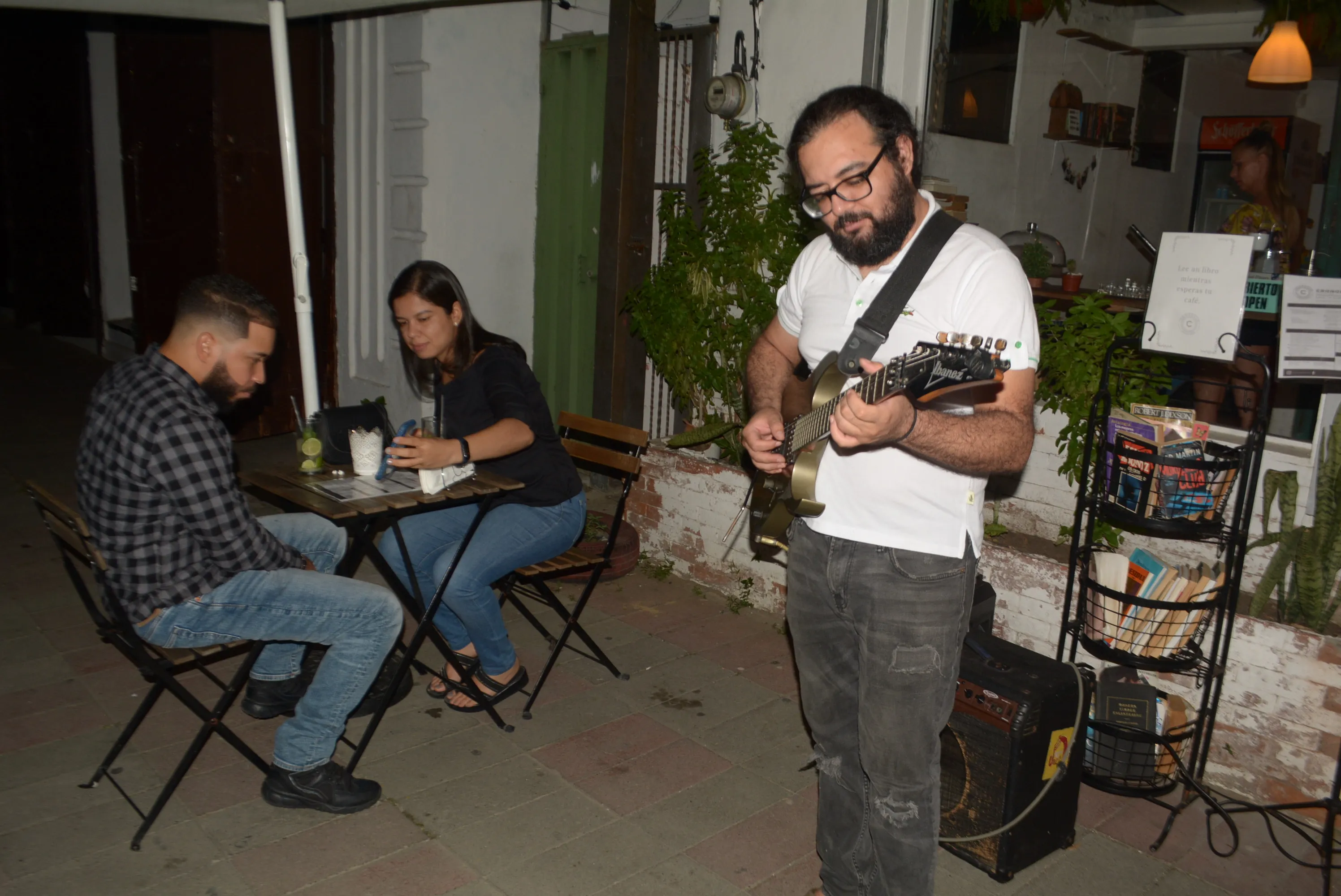 Mientras Erika atiende a los clientes, Carlos Martínez hace el rato más amenos con su guitarra. En ocasiones hay artistas invitados.