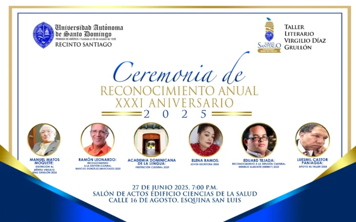 El taller literario Virgilio Díaz Grullón, de la Universidad Autónoma de Santo Domingo, Recinto Santiago, invita a toda la comunidad universitaria y al público en general a participar en el acto conmemorativo y entrega de reconocimiento, en su 31 aniversario, el viernes 27 de junio de 2025, a las 5:00 p.m., en el Edificio de Ciencias de la Salud, ubicado en la calle 16 de Agosto, esquina San Luis, en esta ciudad de Santiago.