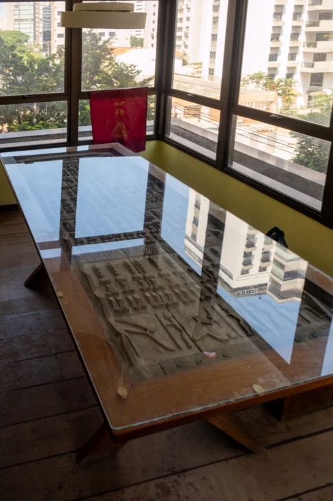Todo ocurrió siempre en favor del vínculo. Esta mesa, una manifestación cultural, artística, espiritual utilizada para desconjurar los peligros que acechaban los resguardos del alimento en África, puerta esculpida en madera, proyectando ancestros, para proteger, reconocer, ahuyentar y preservar lo esencial del alimento. La mesa, testimonio del vivir juntos, crear juntos, de estar juntos. Esta figura en sí misma es, para mí, un pacto existencial, donde imágenes antiguas del inconsciente colectivo emergen desde el corazón de la madera que sirve de base o capa para el lenguaje vincular de comidas, reuniones de té, oficinas de cura con artistas… almuerzos virtuales durante la pandemia… el paladar siendo nutrido por estas imágenes antiguas, arcaicas, viscerales de los arquetipos que descansan en la base de nuestra gran conciencia mayor. Esta es la poesía indeleble, amorosa, conmovedora, punzante y honda de la cultura material que marca mis desplazamientos transatlánticos vitales.