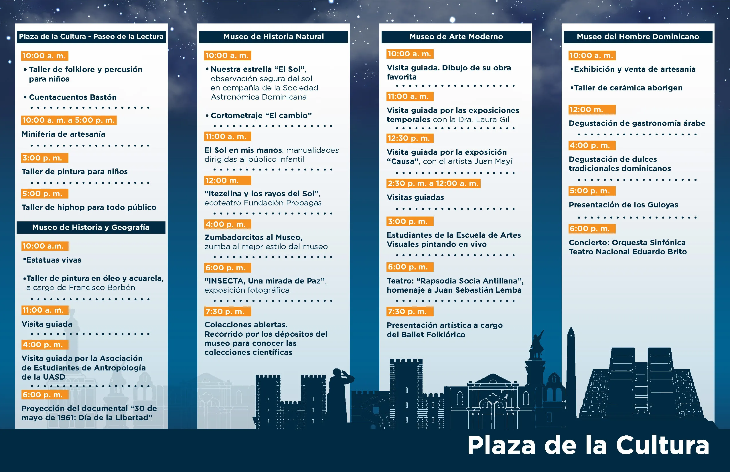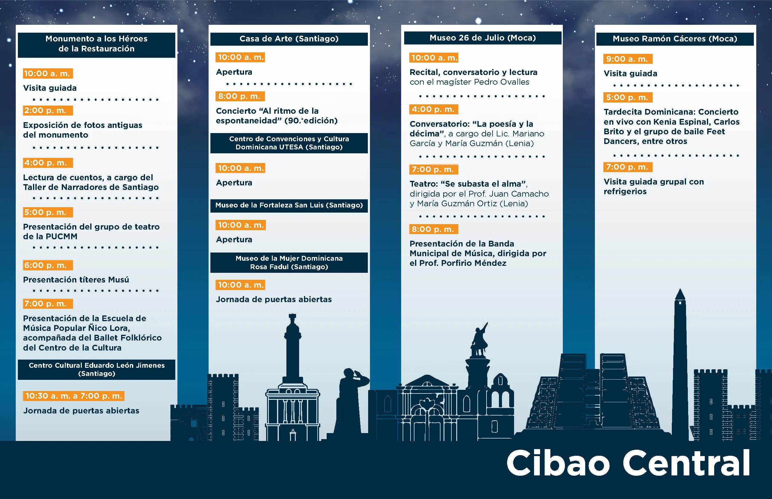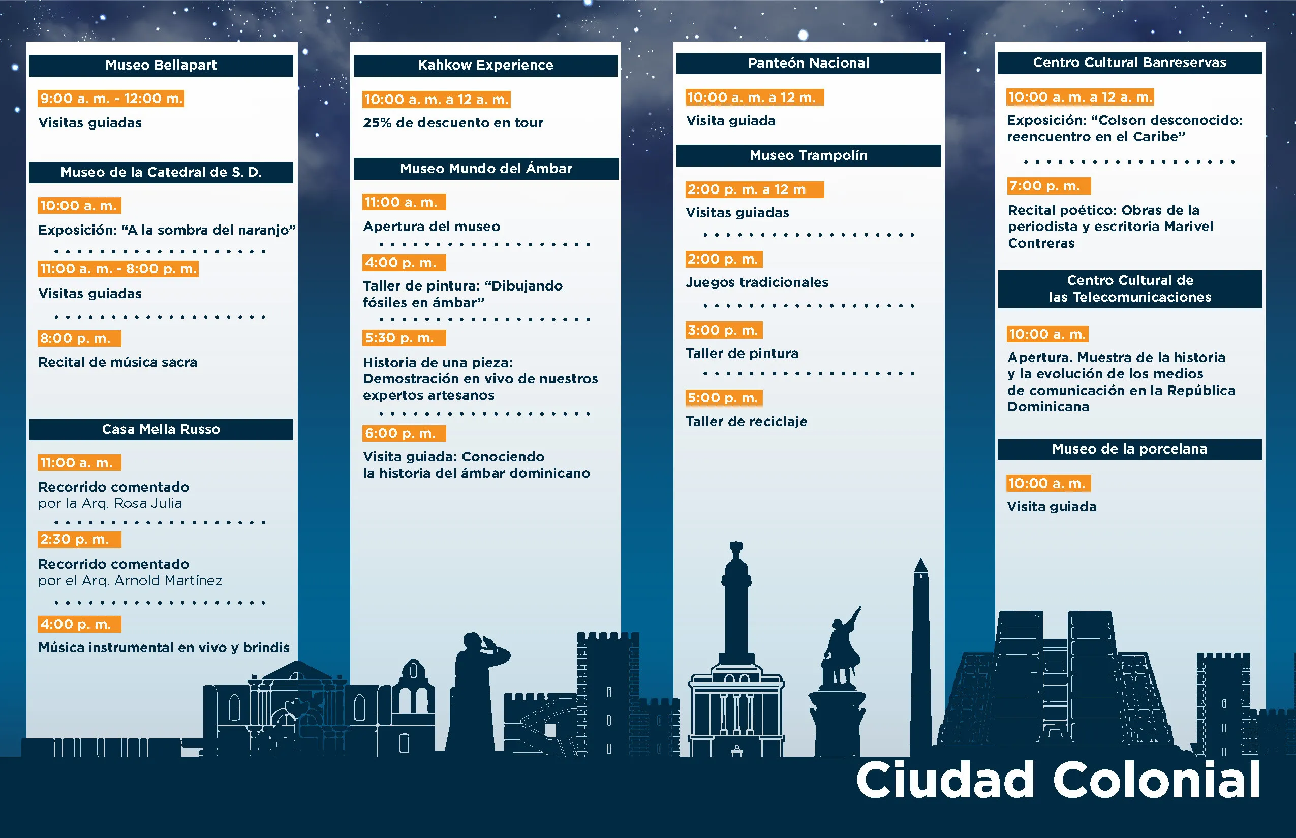 En efecto, se realizarán actividades en los diferentes museos públicos de la Ciudad Colonial y la Plaza de la Cultura Juan Pablo Duarte, en Santo Domingo, así como los situados en Santiago, Puerto Plata y Moca.