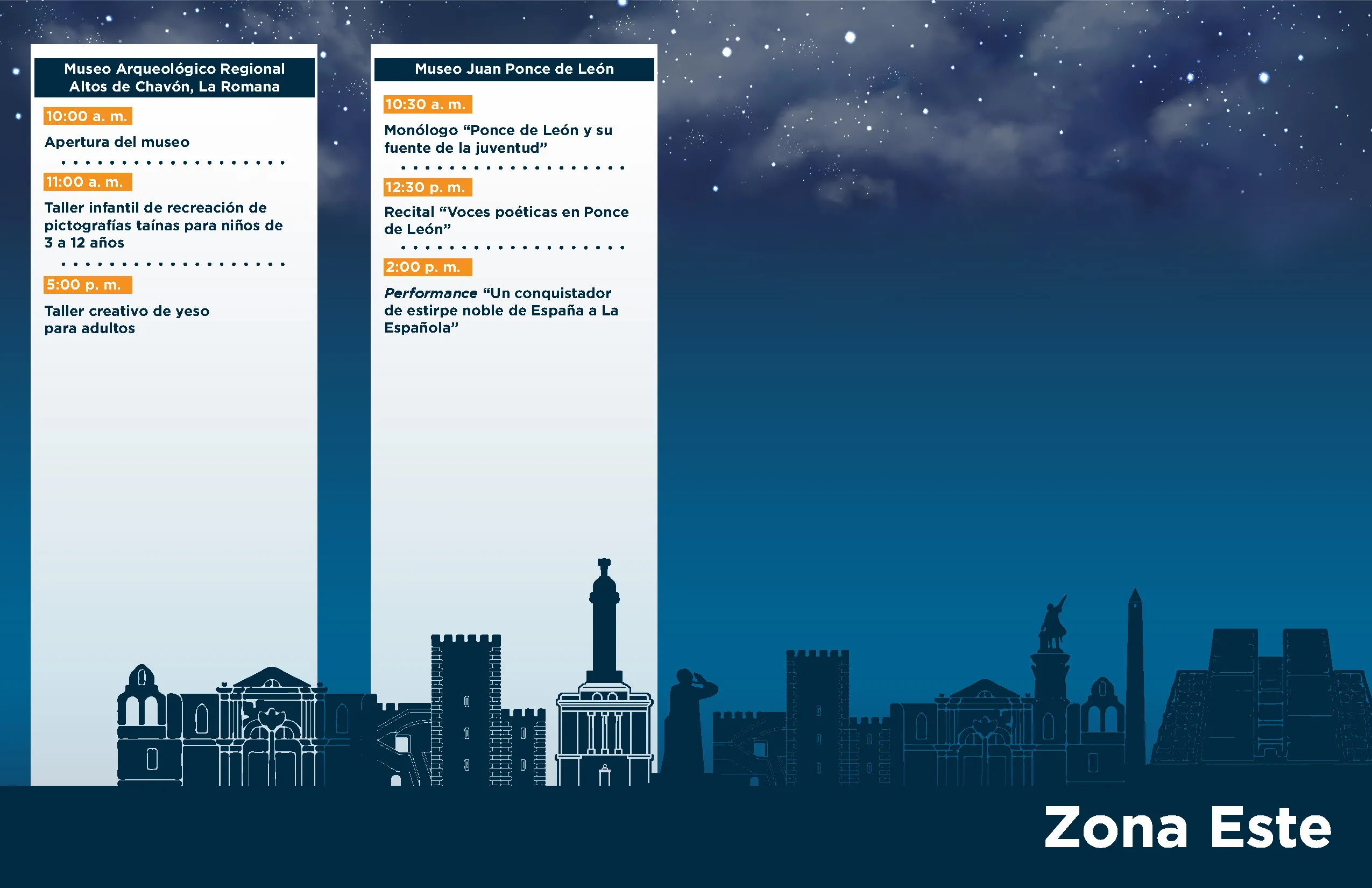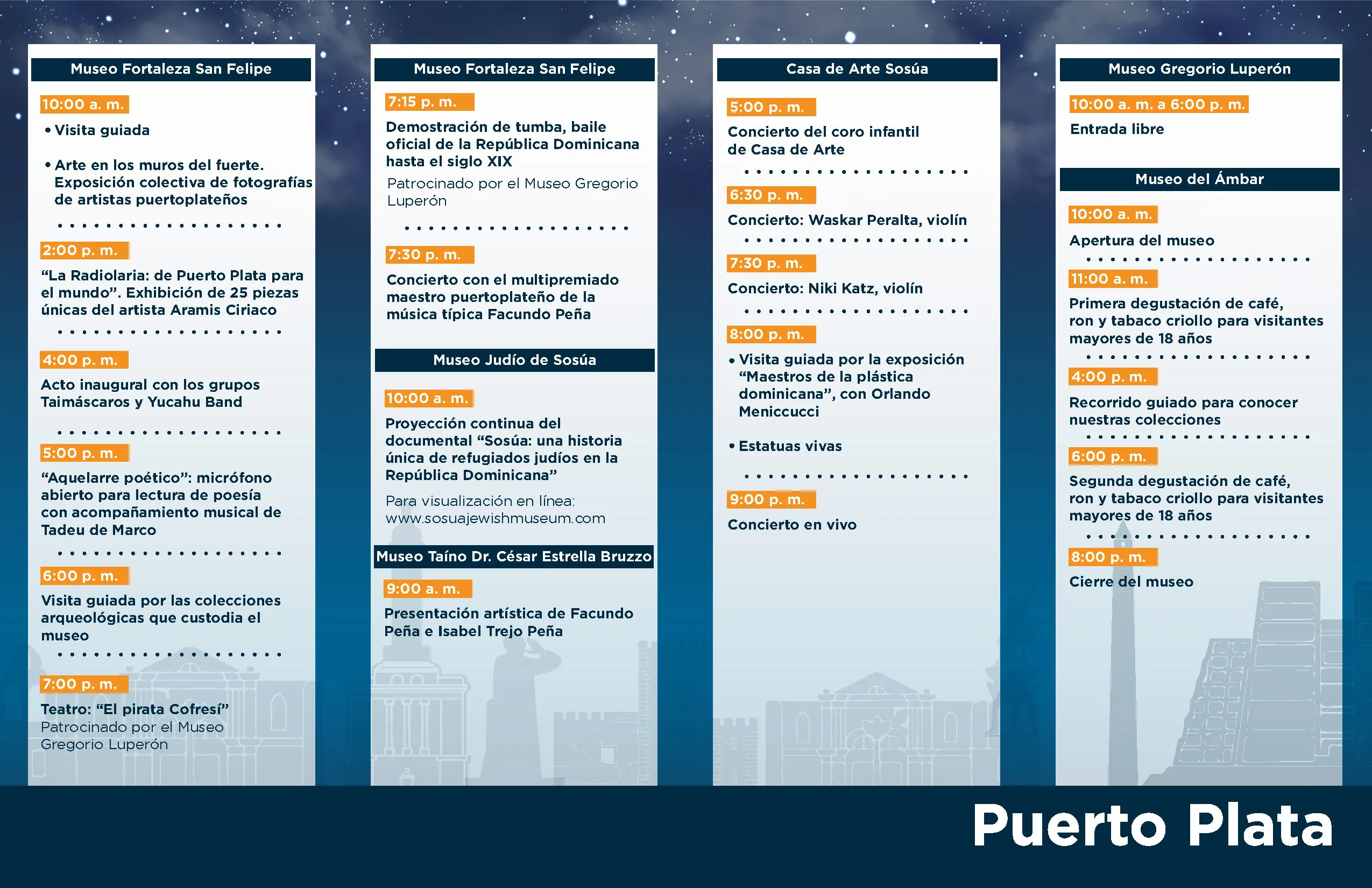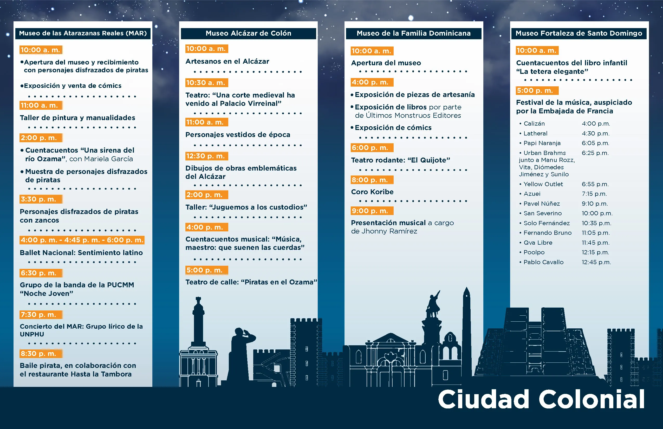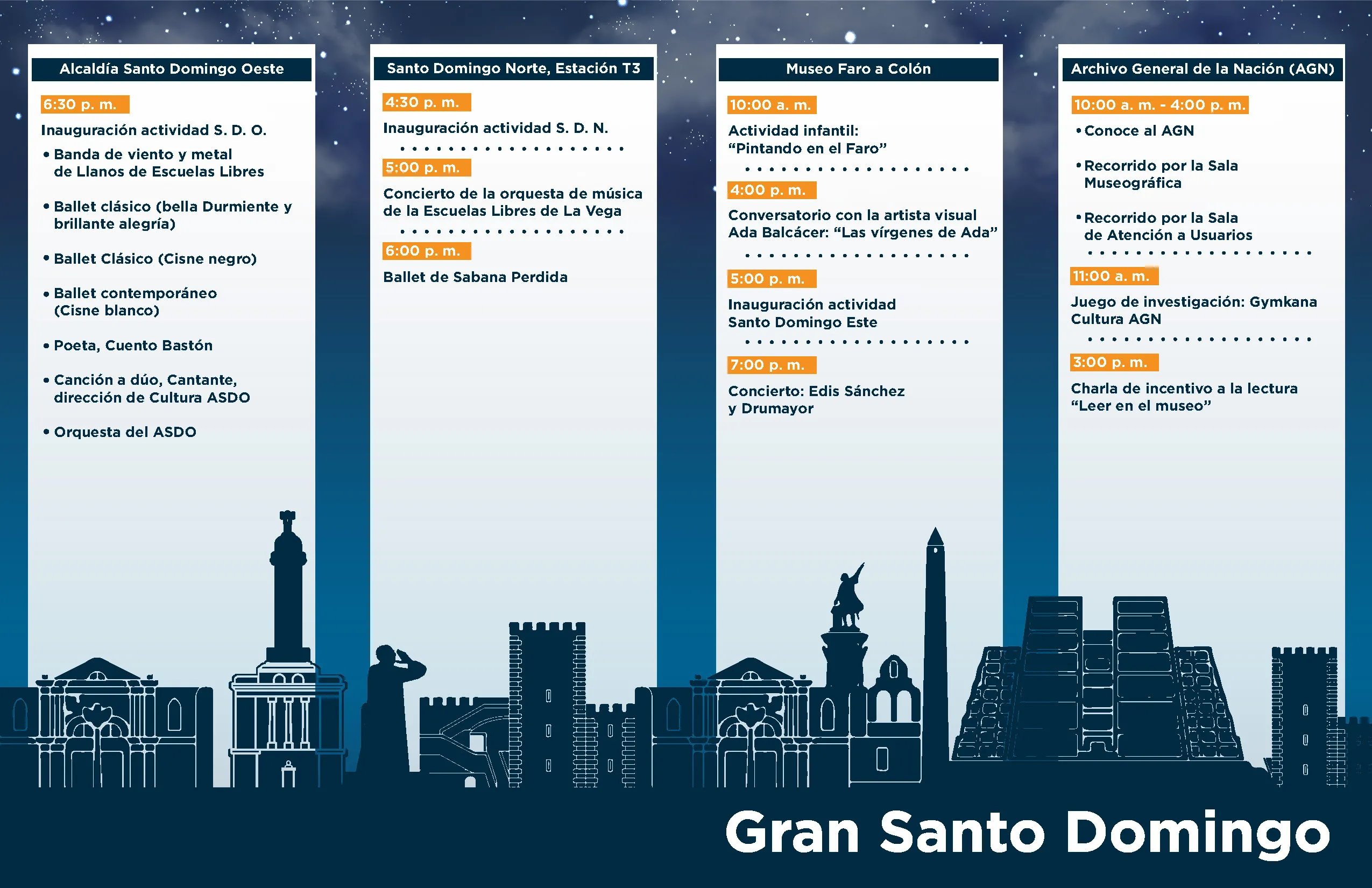 En efecto, se realizarán actividades en los diferentes museos públicos de la Ciudad Colonial y la Plaza de la Cultura Juan Pablo Duarte, en Santo Domingo, así como los situados en Santiago, Puerto Plata y Moca.