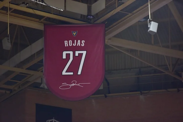 Sadiel Rojas, alero internacional dominicano que estuvo nueve años en el UCAM Murcia Club Baloncesto, vio retirada su camiseta con el número 27, su apellido, su firma y el escudo del club, la primera que la entidad cuelga del techo del Palacio de los Deportes en cuatro décadas de historia.