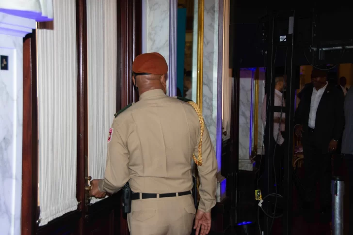 A las 4:49 una voz en off indica: “Señores, su atención, por favor. Les solicitamos que ocupen sus asientos a la mayor brevedad”. Los guardias, ubicados al lateral izquierdo, cierran las puertas y advierten: “Nadie entra, nadie sale, mientras y durante esté el primer mandatario dominicano”.