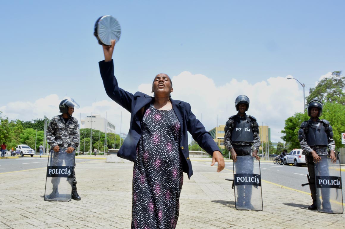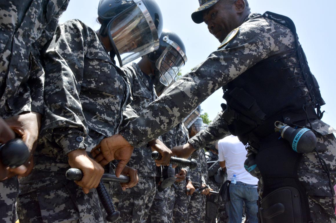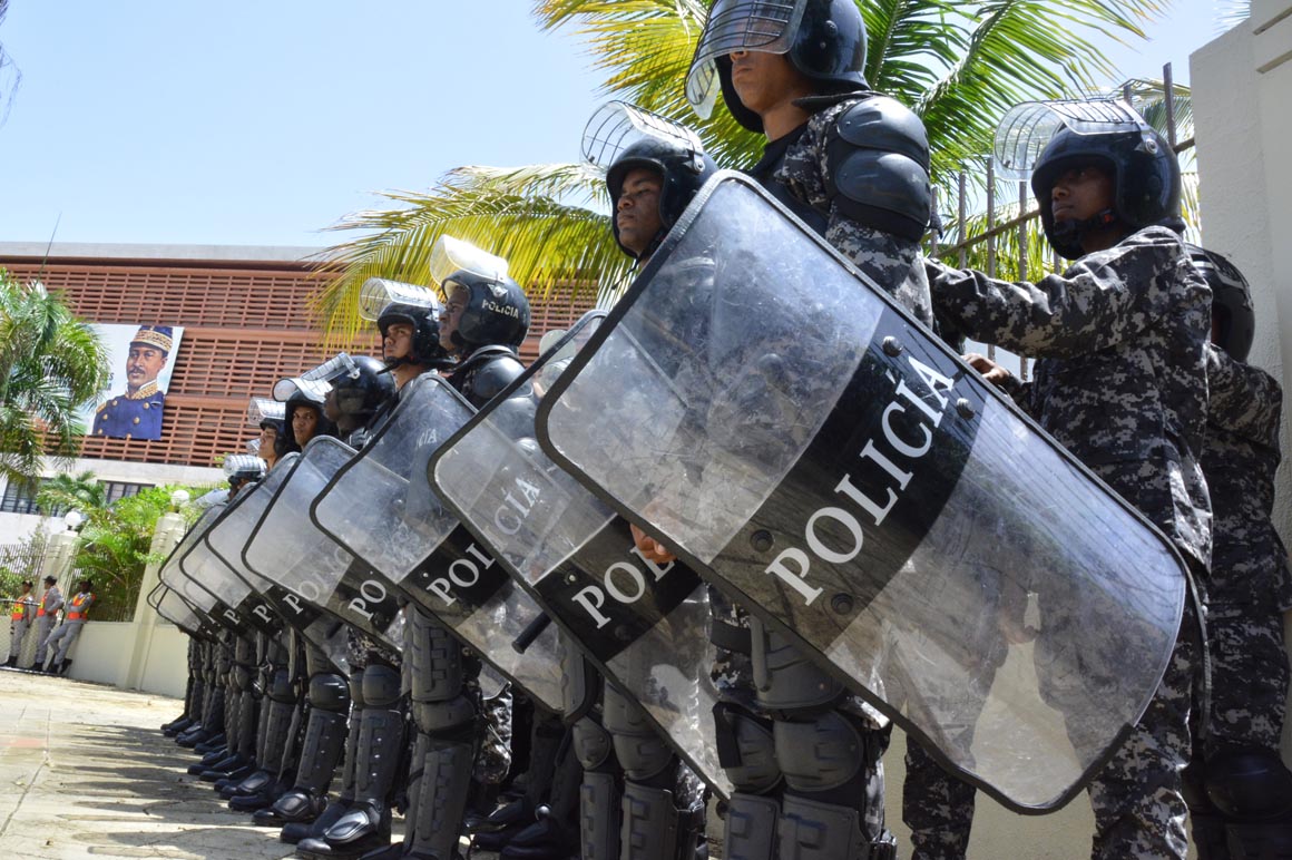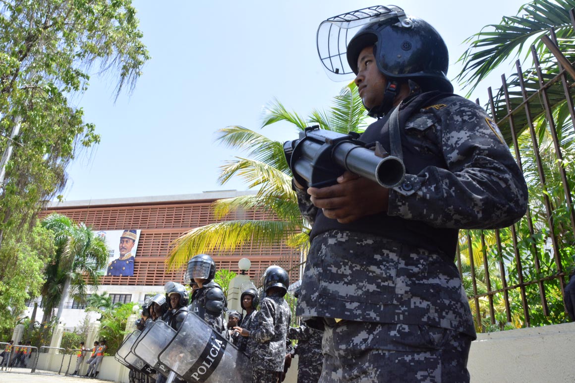 Armados y protegidos hasta los dientes, los agentes protegían la entrada al parlamento dominicano. Cascos negros, chalecos antibalas, rodilleras, coderas y armas largas llevaban los oficiales para detener cualquier imprevisto.
