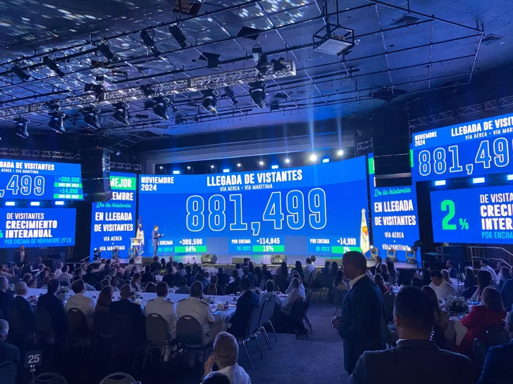 Cuando la pantalla presentó “Resultados del turismo dominicano, noviembre 2024” en letras blancas y rojo, Collado hizo un llamado a los titulares de las entidades de intermediación financiera del BHD, Popular y Banreservas, para “celebrar los números”.