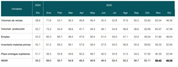 El Índice Mensual de Actividad Manufacturera (IMAM) se ubicó en 49.1 en diciembre de 2025, disminuyendo con respecto al valor del mes anterior (59.4) y cayendo por debajo del umbral de 50. Este comportamiento se debió, fundamentalmente, a la baja en las variables “ventas” y “producción”.