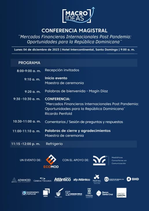 Esta actividad esta titulada Mercados Financieros Internacionales Post Pandemia: Oportunidades para la República Dominicana, se presentará a las 9:00 de la mañana en el Hotel Intercontinental el 5 de diciembre.