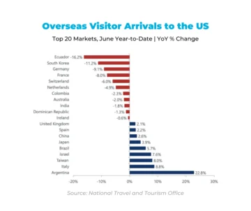 Sin embargo, las llegadas internacionales cayeron un 3.4 % en junio en comparación con el año anterior, lo que sitúa la disminución general para 2025 en el 1.2 %.