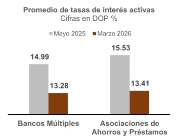 En ese tenor, el promedio de la tasa de interés activa de la banca múltiple pasó de 14.99 % en mayo de 2025 a 13.28 % en marzo de 2026, para una disminución de 171 puntos básicos.