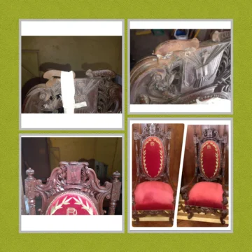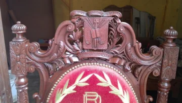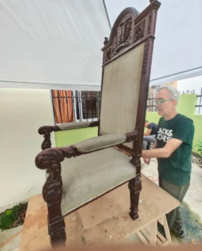 R: En la parte central del respaldo de la silla, se encuentra el escudo de República Dominicana. Y estaba en mal estado, siendo madera de caoba. Se mantenía por estar pegado por la parte de atrás con cinta adhesiva. Las piezas se podrían haber perdido. También anteriormente fue barnizada con un barniz sintético con color caoba, creando una falsa pátina, y un color muy artificial, poco natural de la misma caoba. Envolví la tela durante los trabajos, por estar en muy buen estado. Siendo de alta calidad, irrepetible. Procedimos a limpiar la madera, quitando ese barniz sintético. Para después ponerle un lacado más natural, dejando ver el color natural de la caoba. A nivel personal, para mi fue toda una emoción volver a unir y colocar bien el escudo dominicano. Esta silla hoy preside los consejos de ministros, sentada en ella el presidente de la República, en la que determina con el gobierno procesos de leyes y decretos.