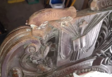 R: Pues que el escudo de la nación estaba bastante roto y pegado con cinta adhesiva por detrás para sujetar la palabra Dios. Le pegamos inmediatamente todo el escudo. Seguro que el usuario ni observó esa situación que estaba delicada y crítica. Tenía ciertas dificultades de estabilidad en la estructura.
