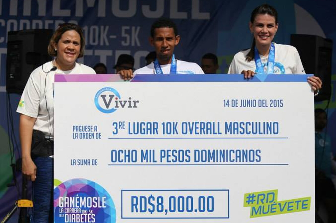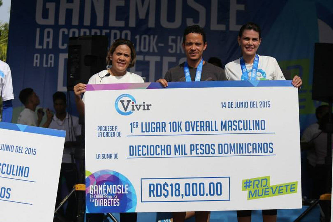Al final de la carrera/caminata se entregaron premios en los diferentes renglones. En la categoría 10 kilómetros masculinos, el tercer lugar lo obtuvo Alfonso Paula por un tiempo de 33 minutos 57 segundos, como segundo finalista Toribio Rosa con 33 minutos 29 segundos y el primer lugar con 33 minutos 01 segundo fueÁlvaroAbreu.