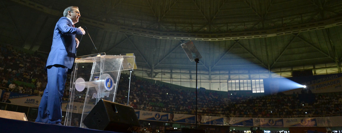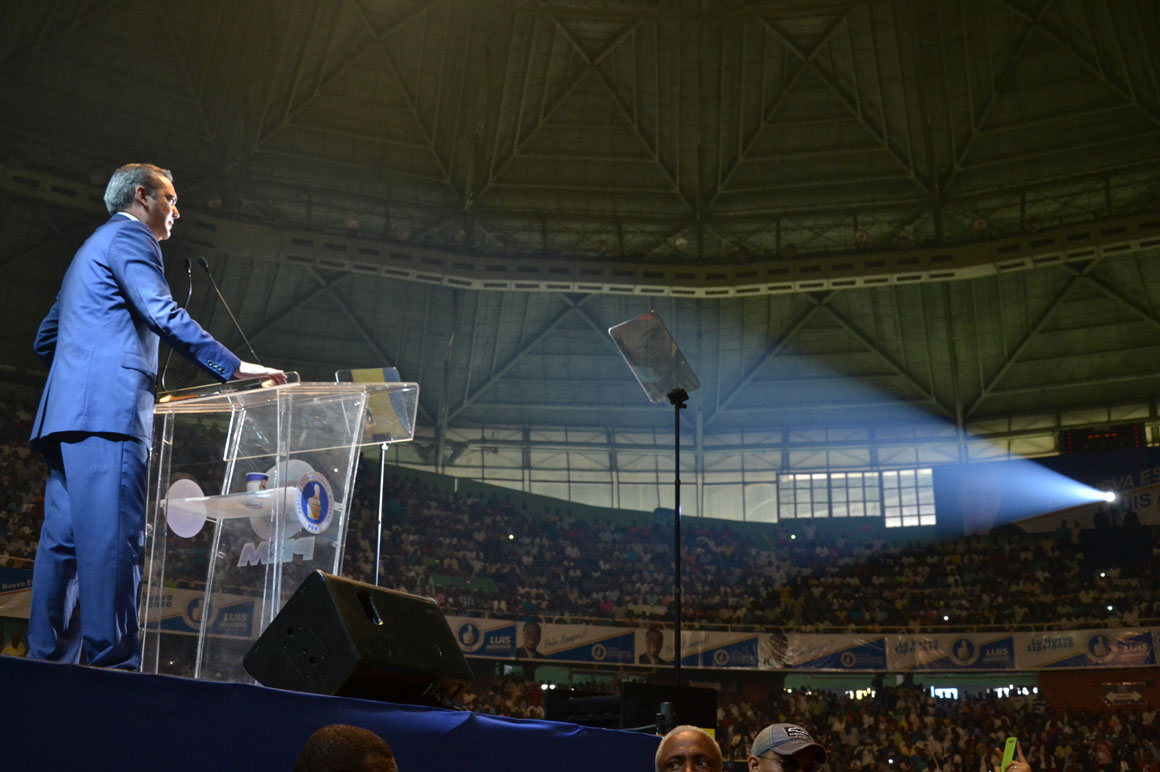 Luego de las presentaciones y los discursos de rigor, el escenario estaba listo para la presentación de Luis Abinader. El candidato ascendió a la tarima por una plataforma en medio de una extendida ovación, fuego pirotécnico y luces.