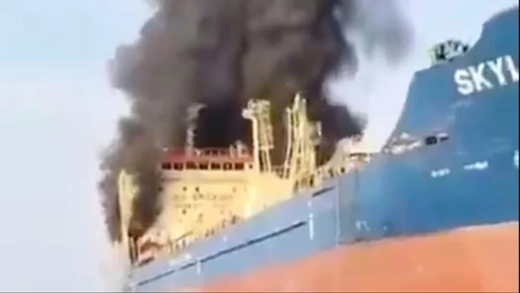 En las imágenes difundidas por televisión, se veía una espesa humareda negra emanando del petrolero, en llamas.