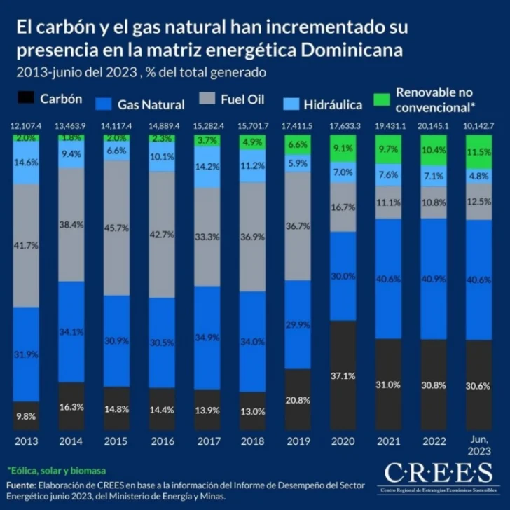 Aunque la matriz energética de RD esta diversificada, es el gas natural, energía eólica, fotovoltaica y carbón, las principales fuentes de producción, la demanda sigue aumentando, especialmente por el crecimiento urbano y la industrialización.