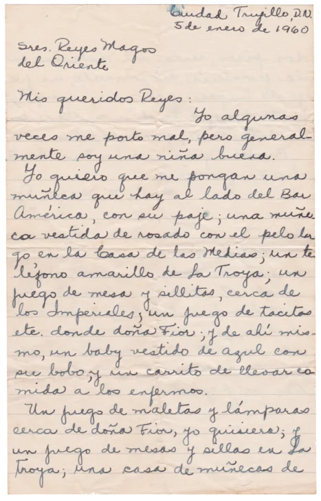 Dentro de mis labores de arqueología de papeles, neveras, patios y cuantas texturas brinden accesos a la “razón poética” de la que hablaba María Zambrano, comparto esta carta manuscrita del 5 de enero de 1960. La escribió la niña Lulú M. Mejía G., al parecer hermana de “Cucha”, según se podría inferir de la postdata. Es una carta a los “Señores Reyes Magos”, en un Santo Domingo todavía Ciudad Trujillo. La obtuve en uno de esos álbumes familiares que a veces se encuentran en los puestos de libros viejos. Sospecho que su autora tendrá poco más de 70 años, si es que la matemática no me falla, a partir de los 66 años de su redacción.
