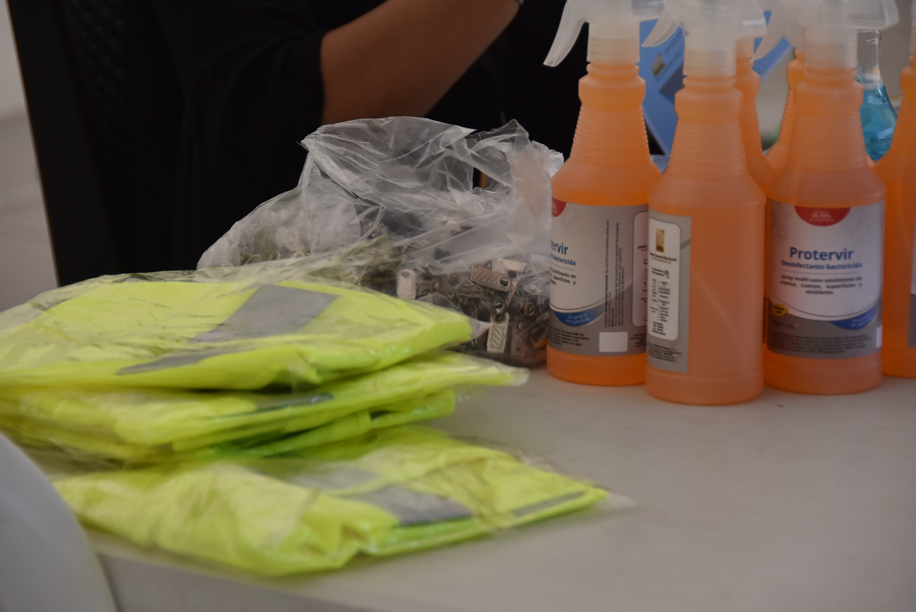 El kit del facilitador auxiliar es de higienización. Tiene desinfectante y una cinta métrica para medir el distanciamiento de los votantes.