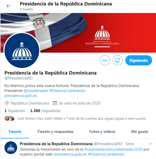 Por otra parte, se creó este 16 de agosto en la misma red social, una nueva cuenta usando el nombre @PresidenciaRD, la cual pone como descripción “Escribamos juntos esta nueva historia. Presidencia de la República Dominicana. Presidente @LuisAbinader #EstamosCambiando”