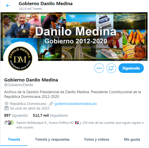 En este caso, aunque los post de la cuenta @PresidenciaRD fueron transferidos a la cuenta @gobiernodanilo, los seguidores se mantuvieron, contando ambas con más de 400 mil personas.