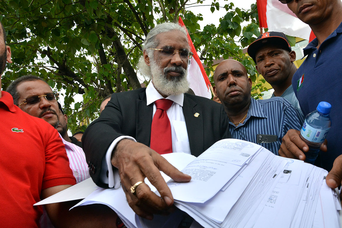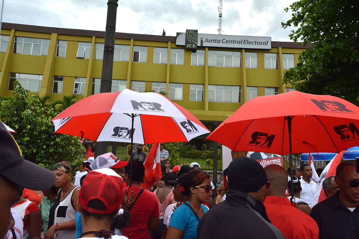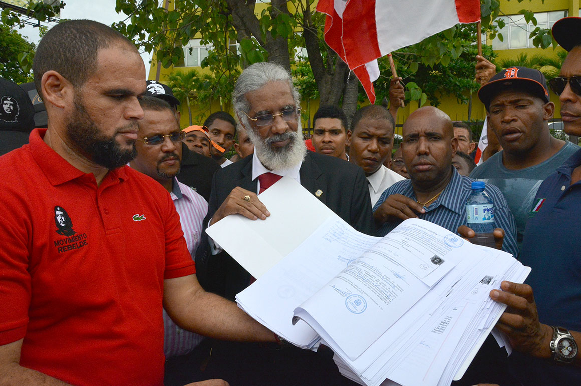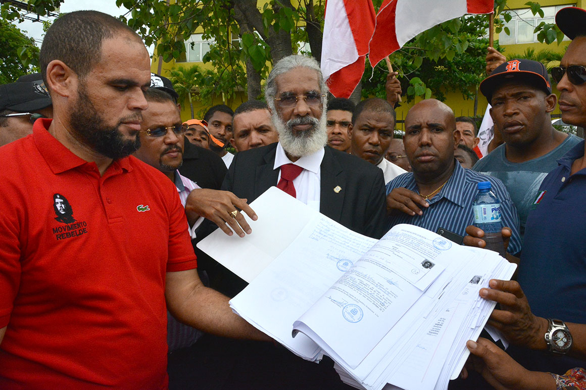 Encabezados por su presidente, Juan Hubieres, cientos de personas se apostaron con guaguas, pancartas, banderas y otros objetos frente a la JCE hasta ser recibidos los documentos.
