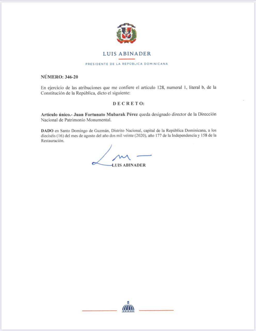 Juan Fortunato Mubarak Pérez, fue designado como director de la Dirección Nacional de Patrimonio Monumental, mediante la orden presidencial número 346-20.
