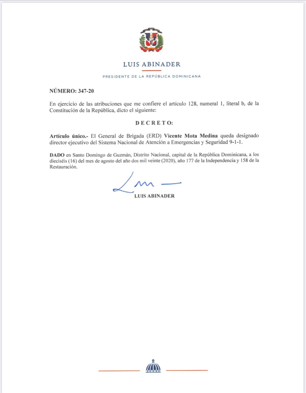 Abinader también nombró a Vicente Mota Medina, elegido como director ejecutivo del Sistema Nacional de Atención a Emergencias y Seguridad 9-1-1. Su designación está contenida en el decreto 347-20.