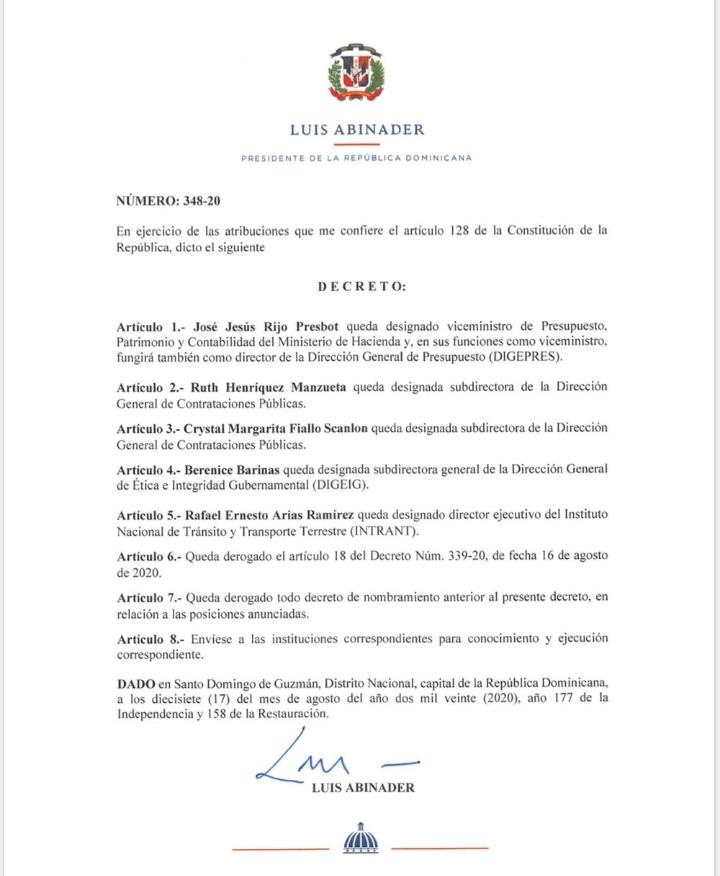 Mediante el decreto 348-20, el gobernante nombró a José Jesús Rijo Presbot, como viceministro de Presupuesto, Patrimonio y Contabilidad del Ministerio de Hacienda.
