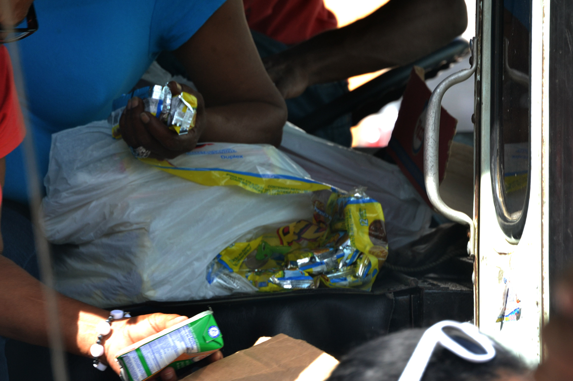 Detrás de una lujosa yipeta lo entrega a una dama, una líder de un grupo que llegó hasta los alrededores de la Arena de Santiago en una guagua.