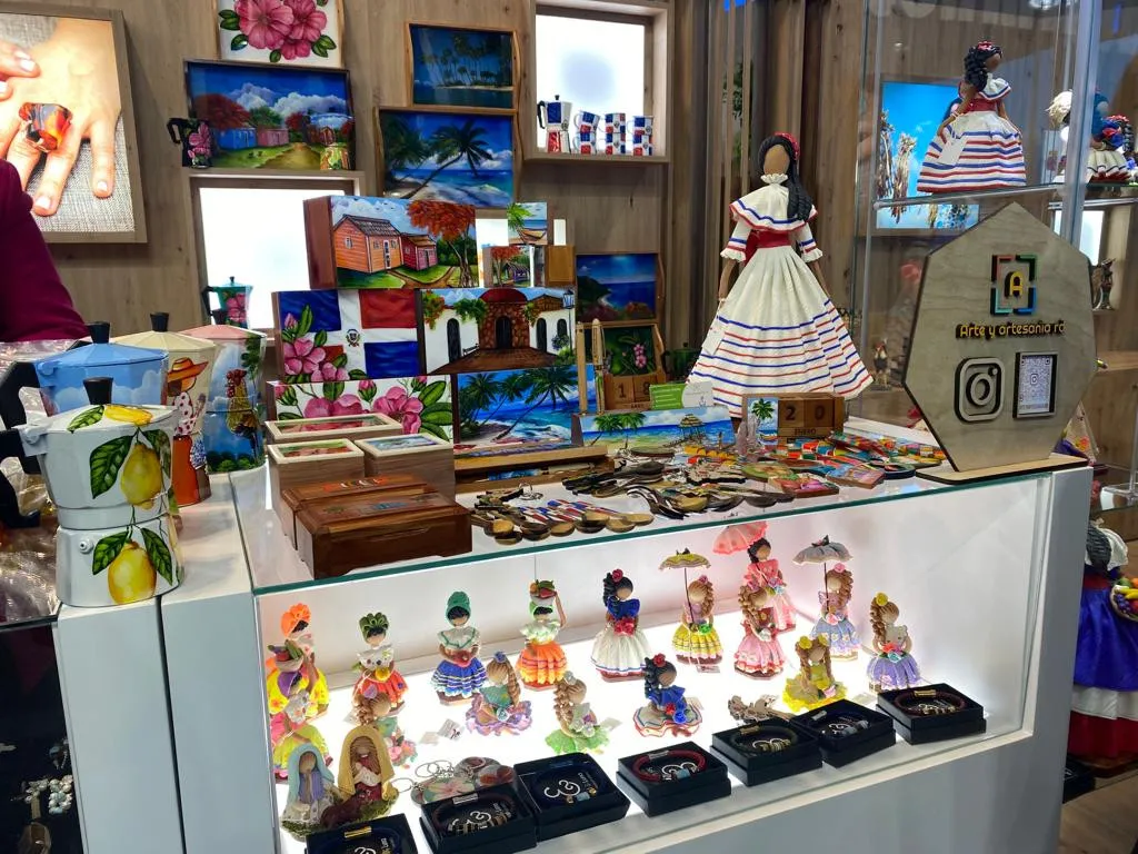 Además, tiene pequeños espacios donde hay muestras de tiendas dominicanas de artesanía, joyas de larimar, bolsas hechas a mano, grecas, muñecas sin rostro o muñecas limé, pinturas y cuatro músicos que al ritmo del merengue típico acaparan la atención hacia el pabellón.